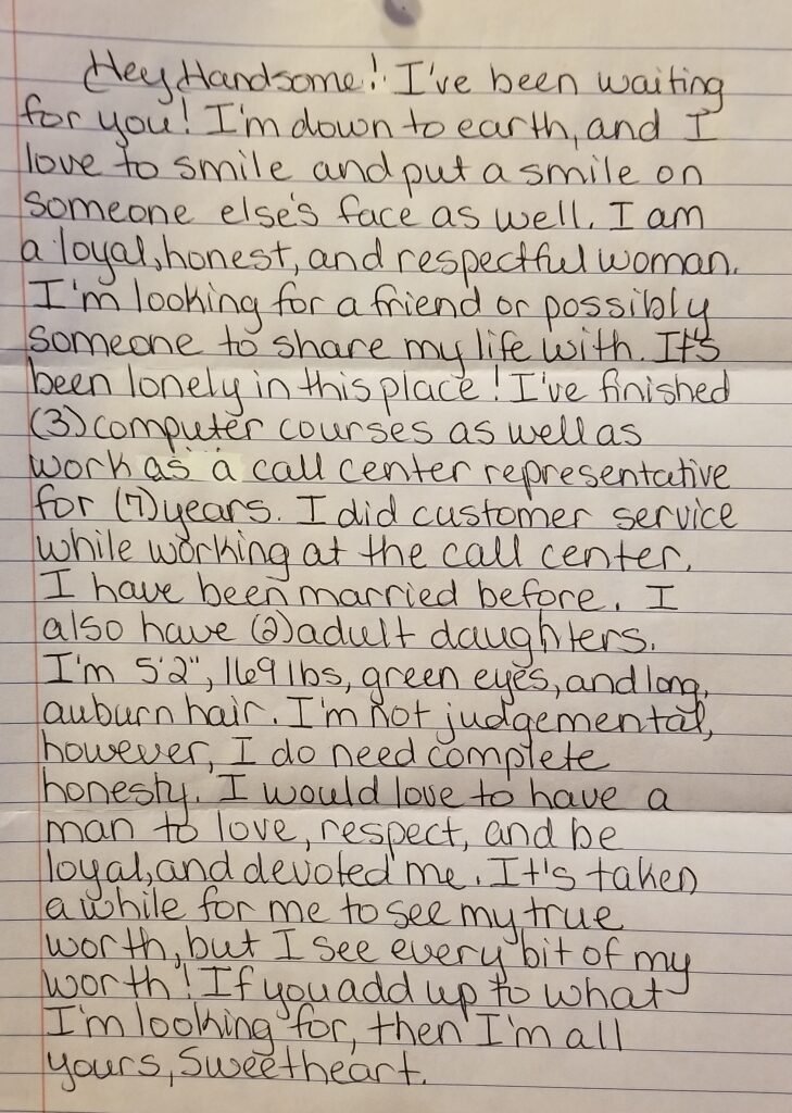 Hello, I’m looking for someone to vibe with while I’m doing time. I’m on a home run stretch only a few months left I need all genuine and positive vibes friends/pen pals—maybe something more. Females only. Hit me up on GTL getting out app best way to communicate