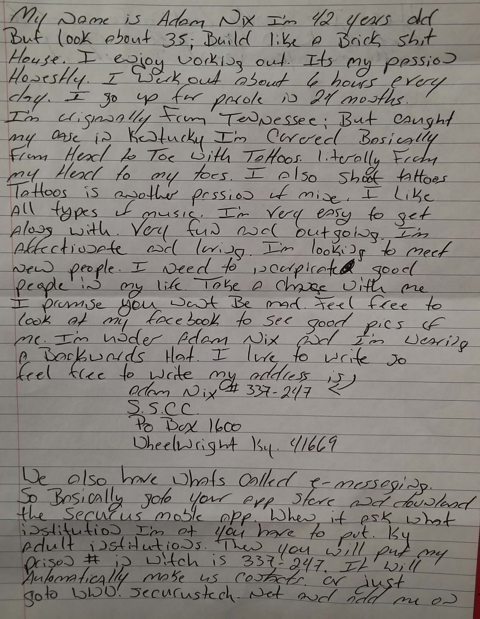 Hey my name is Tyler, I’m 36 years old! I’m currently at CRC doing my 7 year bid and just would like to have someone to talk to. I have family that helps me as much as they can but it would be nice to met someone else to pass...