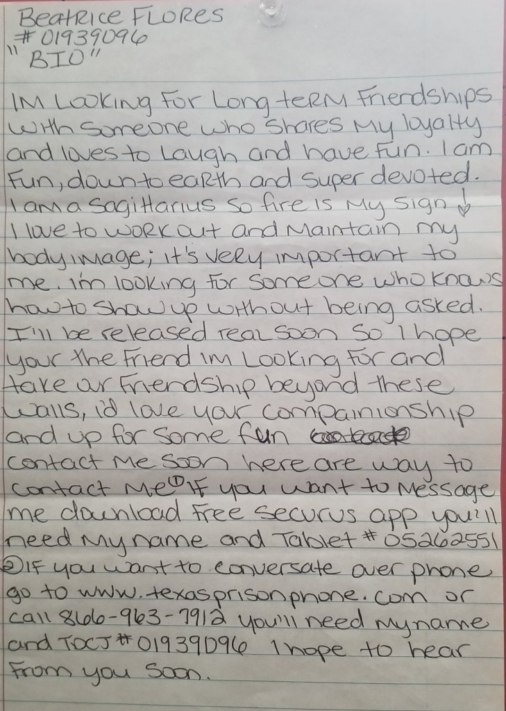 BEATRICE FLORES-01939096 MARLIN UNIT P.O.BOX 660400 DALLAS, Texas, 75266