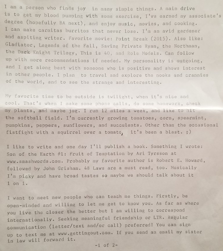 My name is Zack. I’m 27 and I’ve been incarcerated for 10 years. I was out for a short time in the middle. I have 2 years before my full release and I’m looking fr someone to talk to. If you’re looking for a casual person to talk to, where...