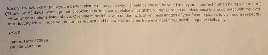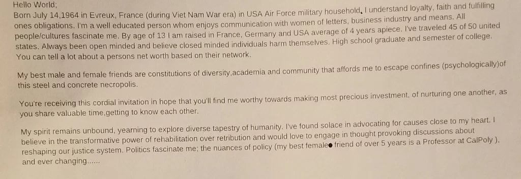First off, I would like to thank you for taking the time to stop by my profile,and to considering to get to know someone incarcerated.I would like to tell you some things about myself.I’m a true gentleman,I’m extremely good natured, adventurous,honest and caring.I’m transparent and empathic..I love helping others,traveling,reading business...