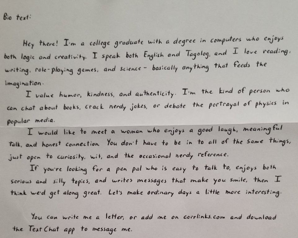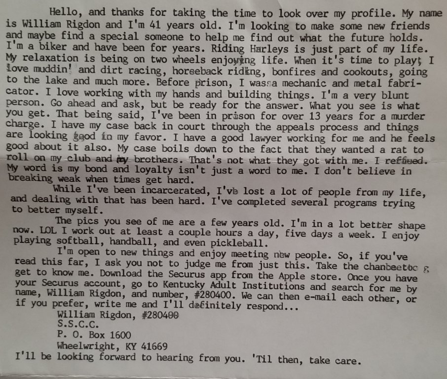 I like to keep it real, and I’m looking for someone to laugh with who makes my time fly. I’ve got two more years in here and a little female attention in a sea of men would be a nice change! Hit me up on getting out if you are...